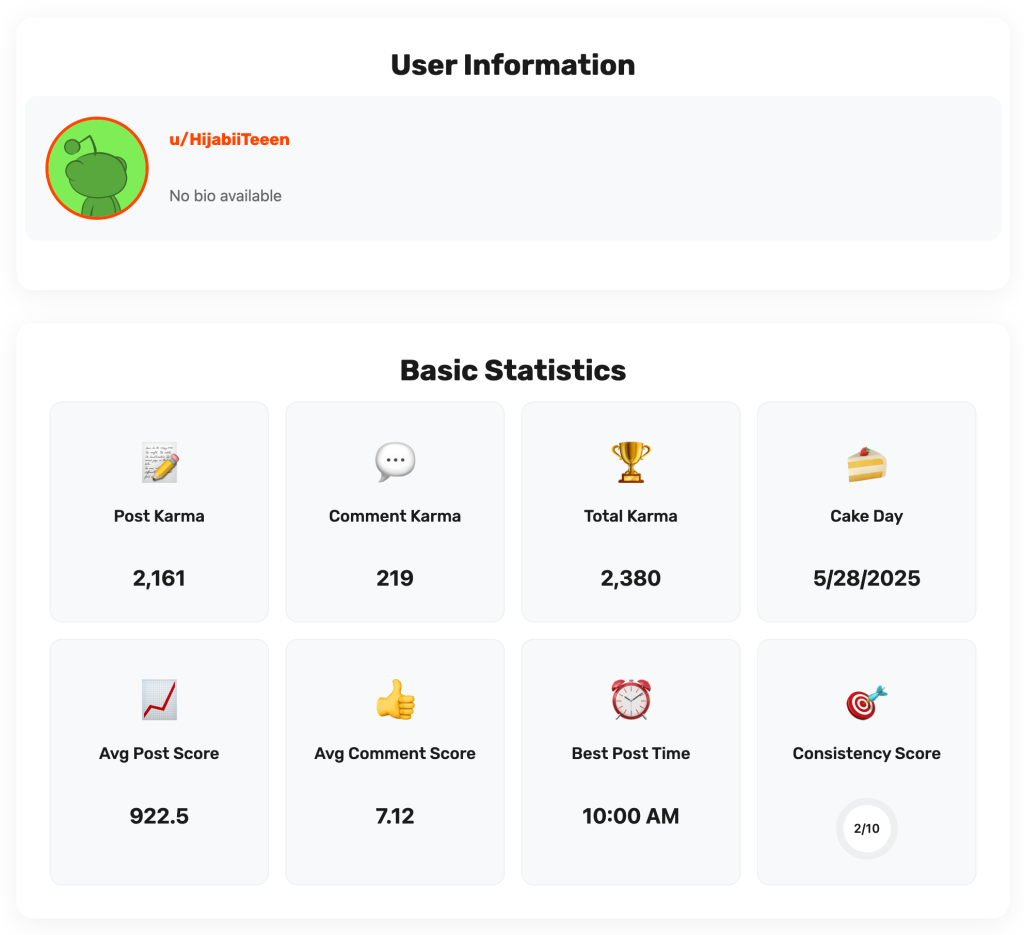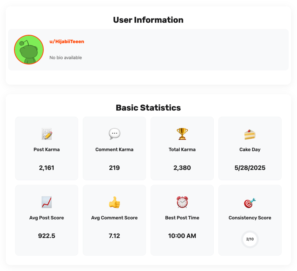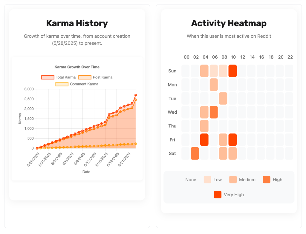Why it matters: High karma signals trust. The split between post and comment karma shows if an account is engaging naturally or just posting links. Best post times help schedule posts for maximum impact.